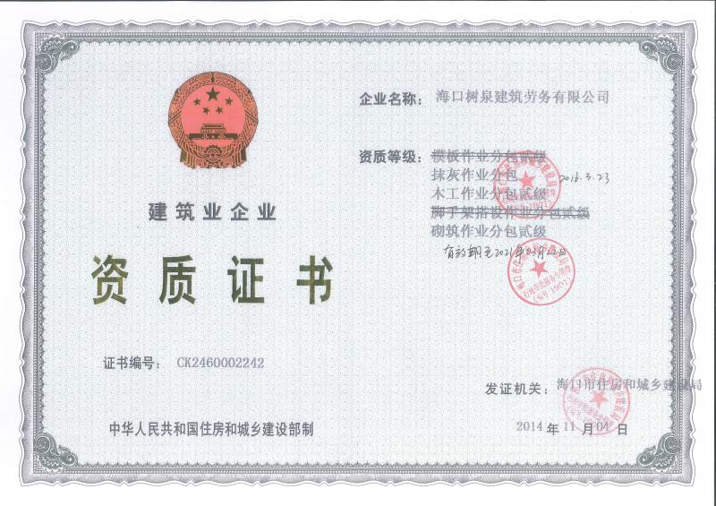 海口樹泉建筑勞務有限公司成立于2011年,公司位于海口,其前身是一家專業(yè)建筑施工隊,自2004年即開始在海南從事建筑勞務施工。自成立至今,公司已經擁有一支科學管理、質量過硬、能打硬仗,搶工期的專業(yè)隊伍。能獨立承擔大中型工業(yè)與民用建筑 、室內外裝修、各類機電設備安裝工程。代表工程有海口濱海華庭、三亞時代海岸T01/02/04/05棟高層、合肥東海花園二期、陵水富力灣B區高層、三亞金中海(酒店)、瓊海大印經典花園、海口環(huán)球海景大酒店(四星級酒店,在建中)、陵水珍珠大廈(五星酒店)、海口萬達廣場、美蘭機場二期。